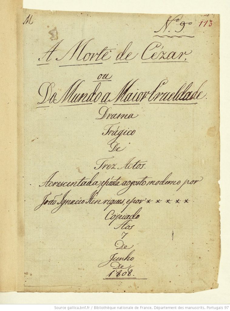 A Morte de Cézar ou do Mundo a Maior Crueldade. Drama Trágico de Trez Actos. Acrescentada, e pósta ao gosto moderno por João Ignacio Henriques, e por *****. Copiado Aos 7 De Junho De 1808